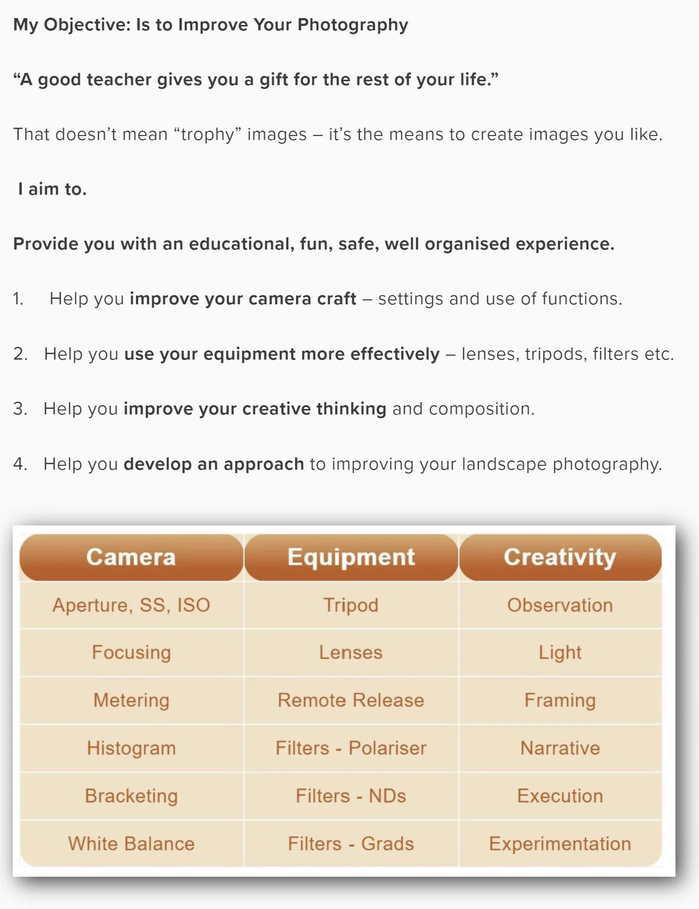 To make the most of your photography workshop, thinking and preparing for your photography workshop outcomes are essential: Have clear learning objectives.
