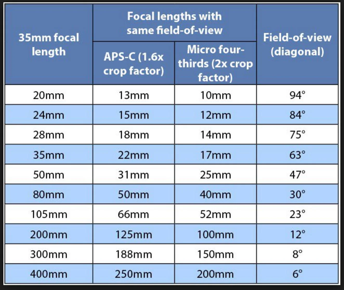 As you can see to obtain, for example, an extreme wide angle of 20mm on a full frame camera you need a crop sensor lens focal length of 13mm and micro 4/3rds sensor focal length of 10mm to give you the same field of view.